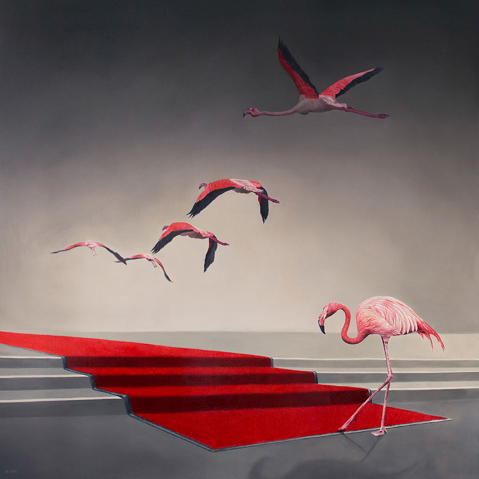FLAMINGOS AND RED CARPET – OIL ON LINEN | 54" X 54"
