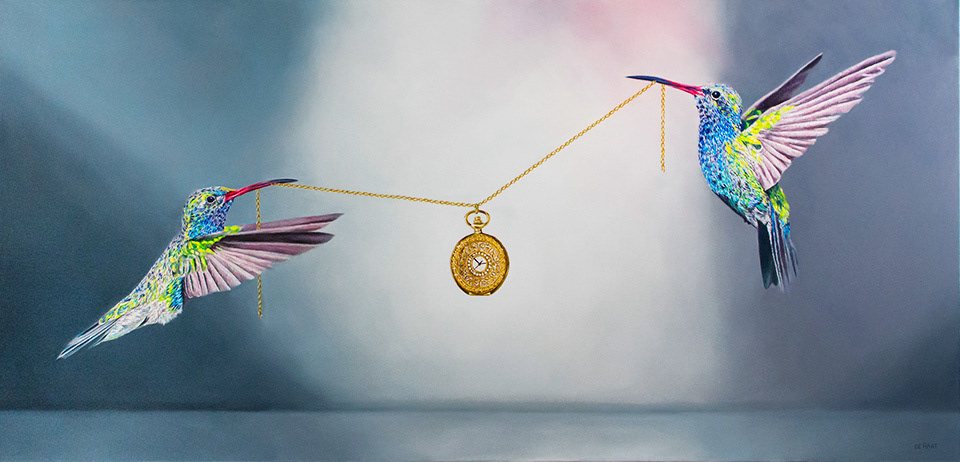 HUMMINGBIRDS AND POCKET WATCH – OIL ON LINEN | 54" X 28"